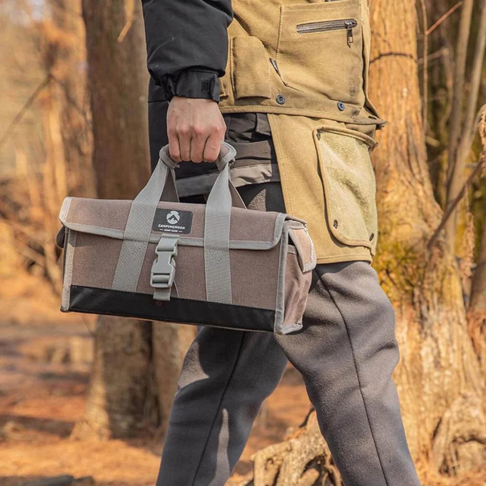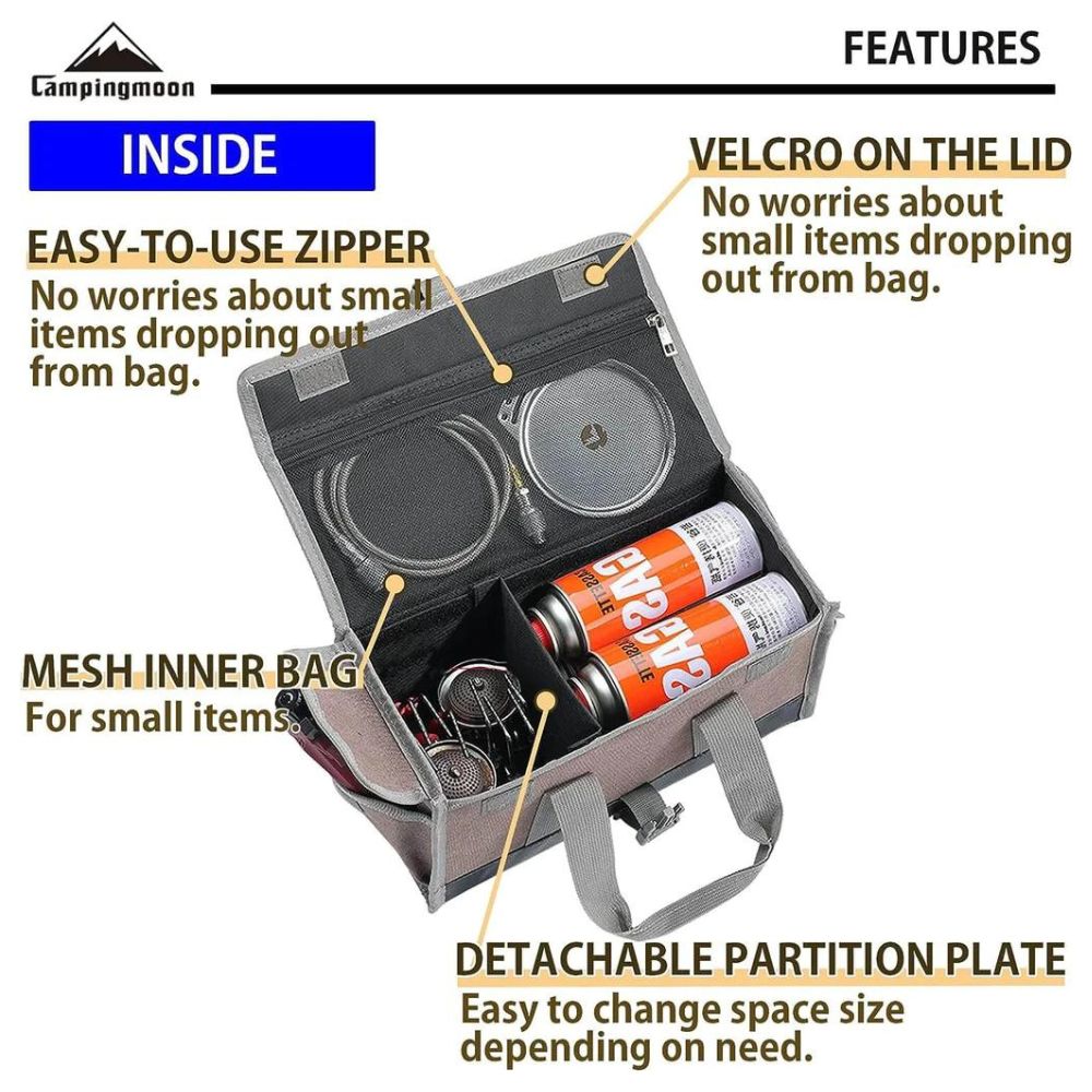 منظم التخييم وحقيبة التخزين، مثالية لأوتاد الخيمة، وعلب وقود غاز البوتان، وأواني الشاي أو القهوة، أو غيرها من معدات التخييم.