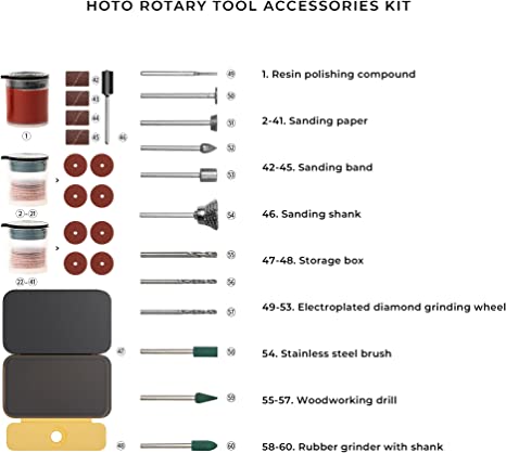 مجموعة ملحقات الأدوات الدوارة HOTO 60 قطعة تتضمن: رأس الحفر: مثقاب نجارة × 3 (3.2 مم × 1، 2.3 مم × 2)؛ فرشاة: فرشاة من الفولاذ المقاوم للصدأ 3.2 مم × 1؛ الصنفرة: ورق الصنفرة 20 مم × 2 صندوق (20 قطعة/صندوق)، شريط الصنفرة × 4، ساق الصنفرة × 1 (3 مم)؛ التلميع: مركب تلميع الراتينج × 1؛ النحت: عجلة طحن ماسية مطلية بالكهرباء × 5 (3 مم)؛ الطحن: مطحنة مطاطية مدببة مع ساق × 1 (3.2 مم)؛ مطحنة مطاطية أسطوانية مع ساق × 1 (3.2 مم)، مطحنة مطاطية ذات رأس دائري مع مقبض ساق × 1 (3.2 مم)؛ صندوق ملحقات 60 × 36 مم × 2.