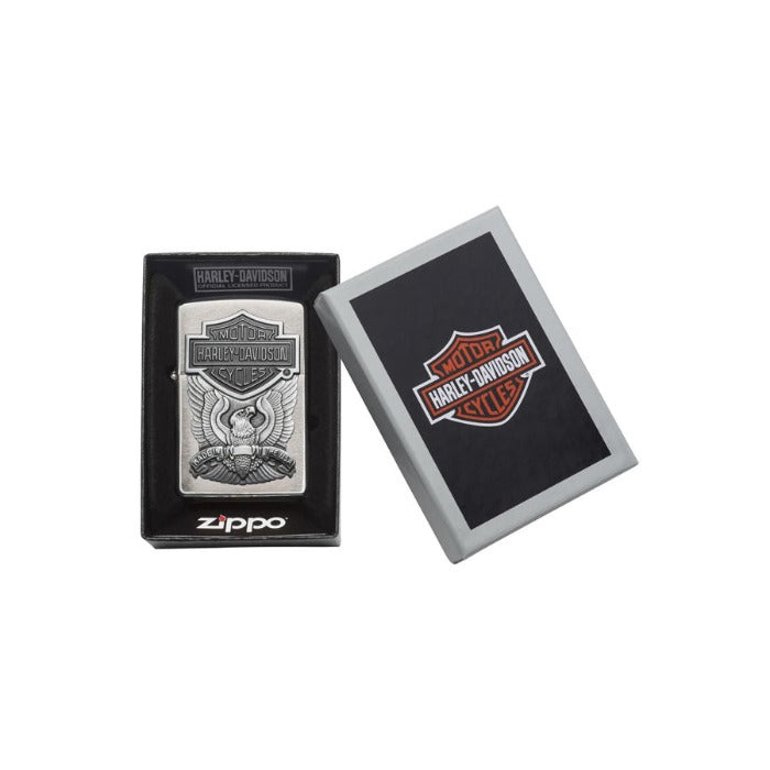 This Brushed Chrome lighter has a Harley-Davidson® emblem attached. Comes packaged in a gift box. For optimal performance, fill with Zippo lighter fuel.