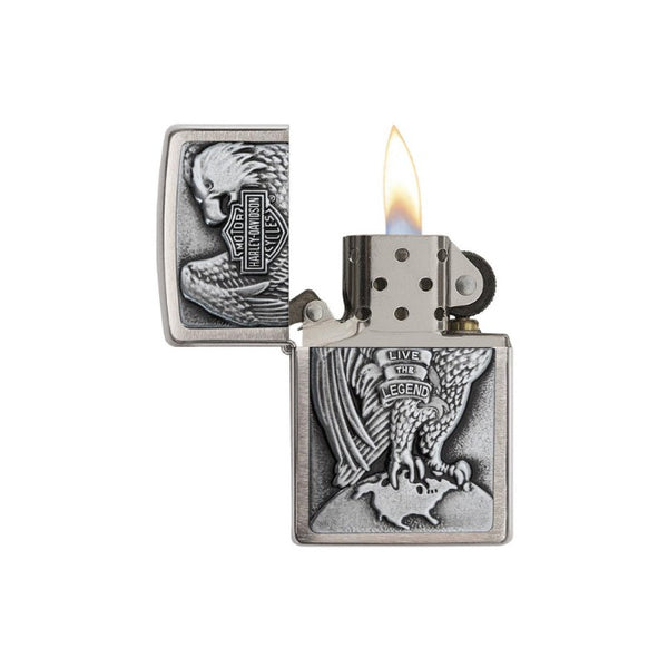 This Brushed Chrome lighter has a Harley-Davidson® emblem attached. Comes packaged in a gift box. For optimal performance, fill with Zippo lighter fuel.