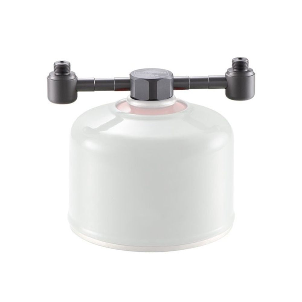 The cylinder adapter converts one cylinder port to two, allowing the cylinder to be used with multiple stoves or gases lamps.