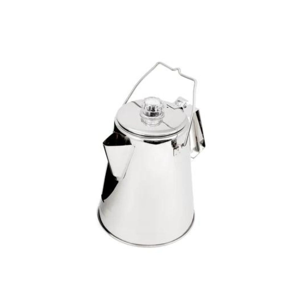Great for brewing coffee for large camping groups, the rugged stainless steel GSI Outdoors Glacier Perc coffee percolator is great for use on both stove top or campfire. Available in multiple sizes, it features heavy-gauge 18/8 stainless steel construction that's resistant to corrosion and will withstand ground impacts. It features a pour spout that minimizes dripping, stainless steel handle, and a stainless steel wire bail handle at the top. The PercView dome made of glass provides a view into brewing progress, and this three-piece percolator includes an inner basket with cover. The campfire Glacier Perc is available in the following sizes: