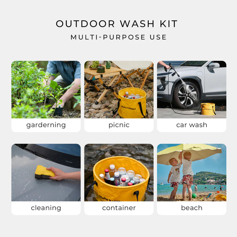 20L High-capacity, full car wash with one bucket. Fabricated with a highly resistant PVC tarp protected against leaks. Easily stored with a press to fold into a compact and convenient shape.
