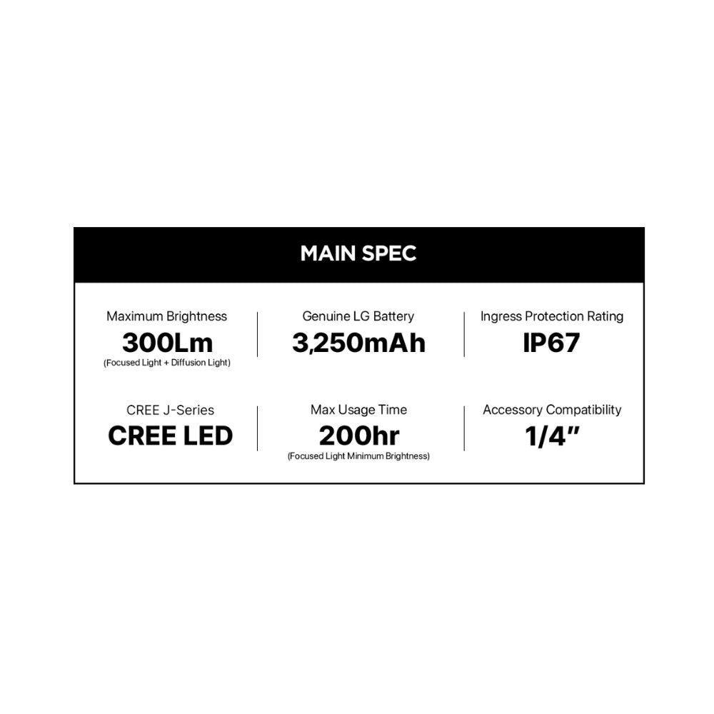 • Two lighting modes: Diffusion mode for wide surface illumination (2,200K) and Focused mode with a powerful beam (up to 150Lm) for specific areas.