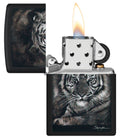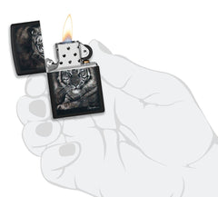 Steven Spazuk, renowned globally as the Fire Painter, employs the fumage technique to create incredibly intricate and breathtaking scenes using only the flame of a lighter. Spazuk's Tiger design is beautifully depicted on this Black Matte lighter through our Color Image process. It comes neatly packaged in a gift box. For the best performance, make sure to fill it with Zippo lighter fuel.