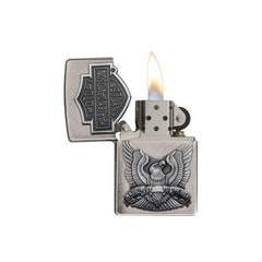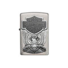 This Brushed Chrome lighter has a Harley-Davidson® emblem attached. Comes packaged in a gift box. For optimal performance, fill with Zippo lighter fuel.