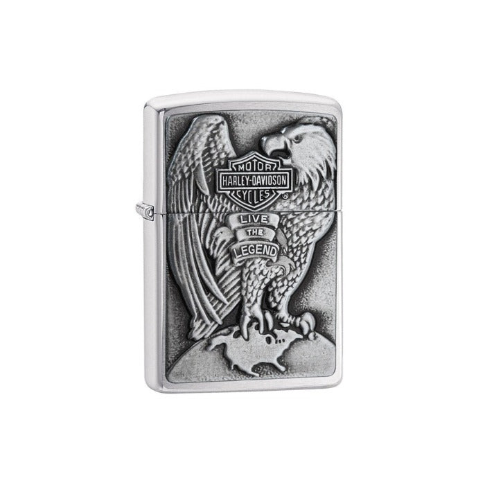This Brushed Chrome lighter has a Harley-Davidson® emblem attached. Comes packaged in a gift box. For optimal performance, fill with Zippo lighter fuel.